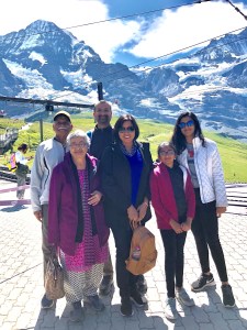 The day went by quickly, as we took in the beautiful sights and surroundings from the top of Jungfraujoch. We had a quick meal at the mountain top restaurant, again under strict instructions from Kid D. about punctuality. On the way back, most people had quietened from tiredness and the thin mountain air. Except, for our esteemed guide. He continued his commentary and in the 5 minutes between train changes, even managed to click the following picture for us, and 10 other families. Of course, all in his ballistic style, snatching my husband’s phone saying “You don’t need to tell me how to use this. Done it many times! Just go stand over there for the picture!!”