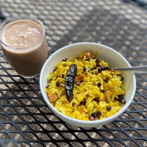 Tamarind rice is a traditional favorite from southern India. It’s actually a comfort food for the natives of that area. Tamarind is a sweet-sour tropical fruit that looks like a pea pod. It is used in many sauces, marinades, chutneys, drinks and desserts, including in Worcestershire sauce. A bowl of tamarind rice with a chocolate-banana-avocado smoothie on the side makes one delicious meal!