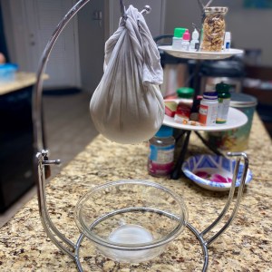 - Dump the yogurt in the cloth and tie it up into a tight bundle. Hang from a hook or a banana holder with a bowl underneath to collect the whey. See picture.