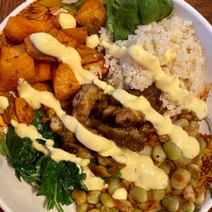 - To serve, place bulger, spinach, roasted sweet potatoes, and lima beans. Place few chicken pieces center and drizzle with turmeric saffron yogurt sauce.